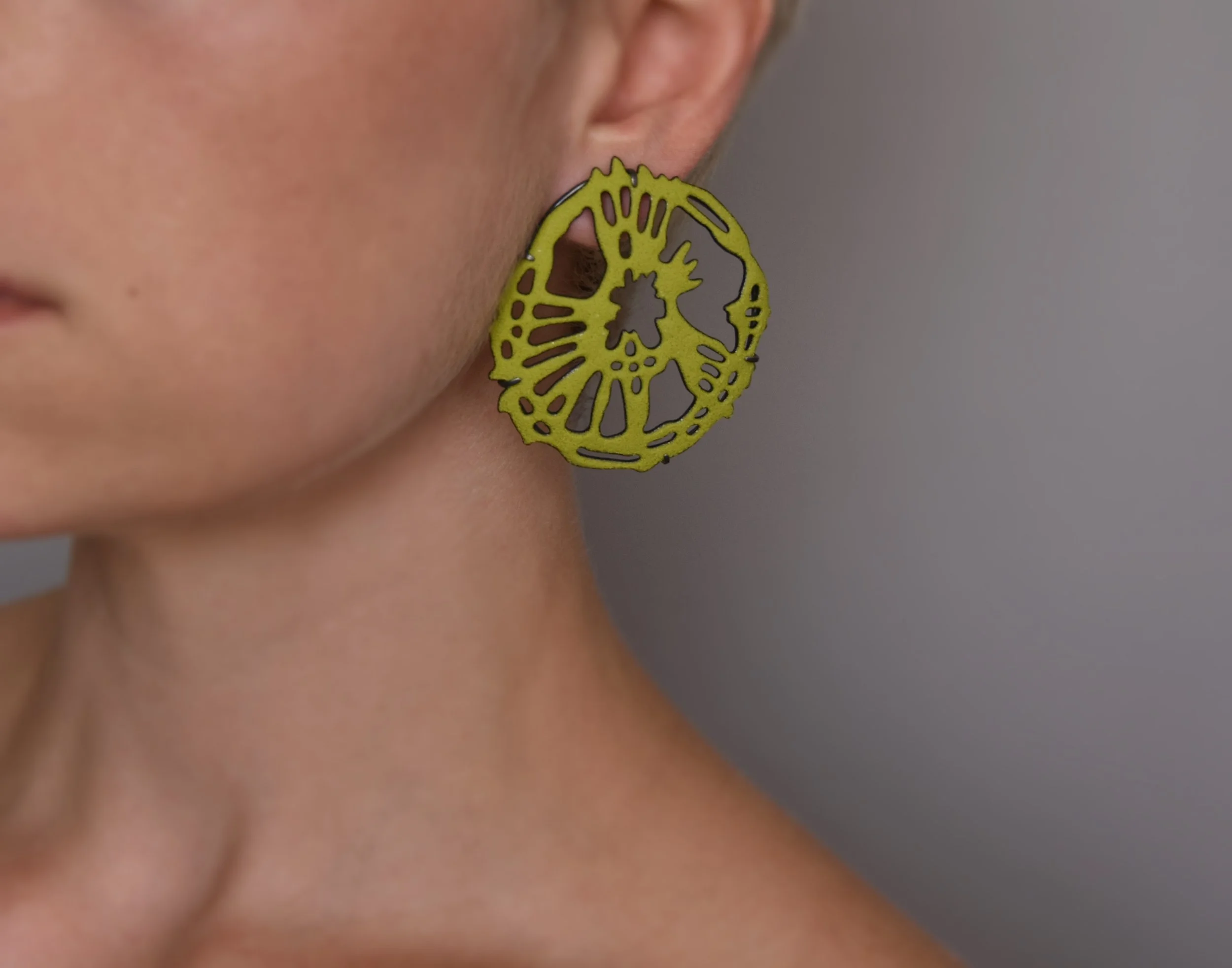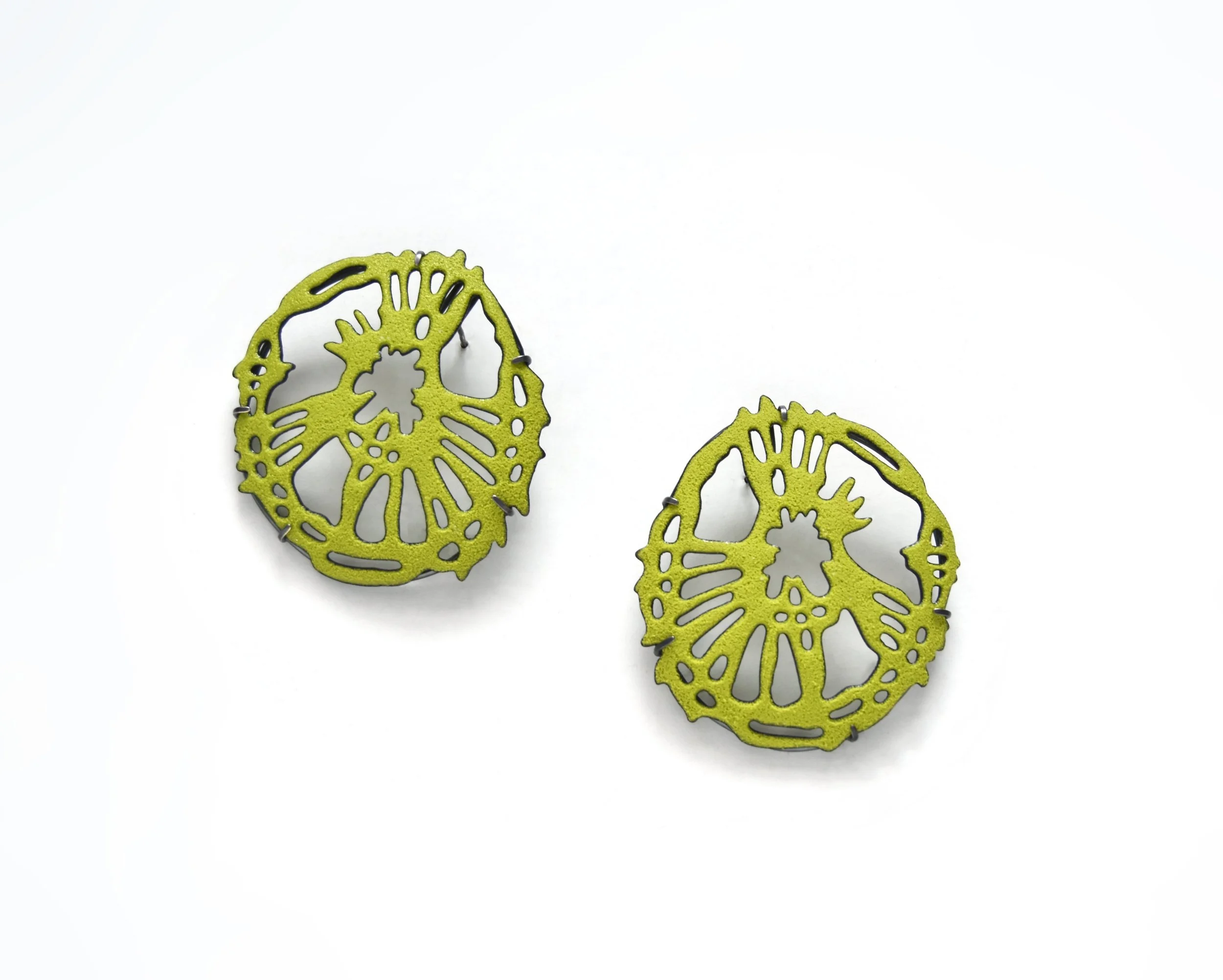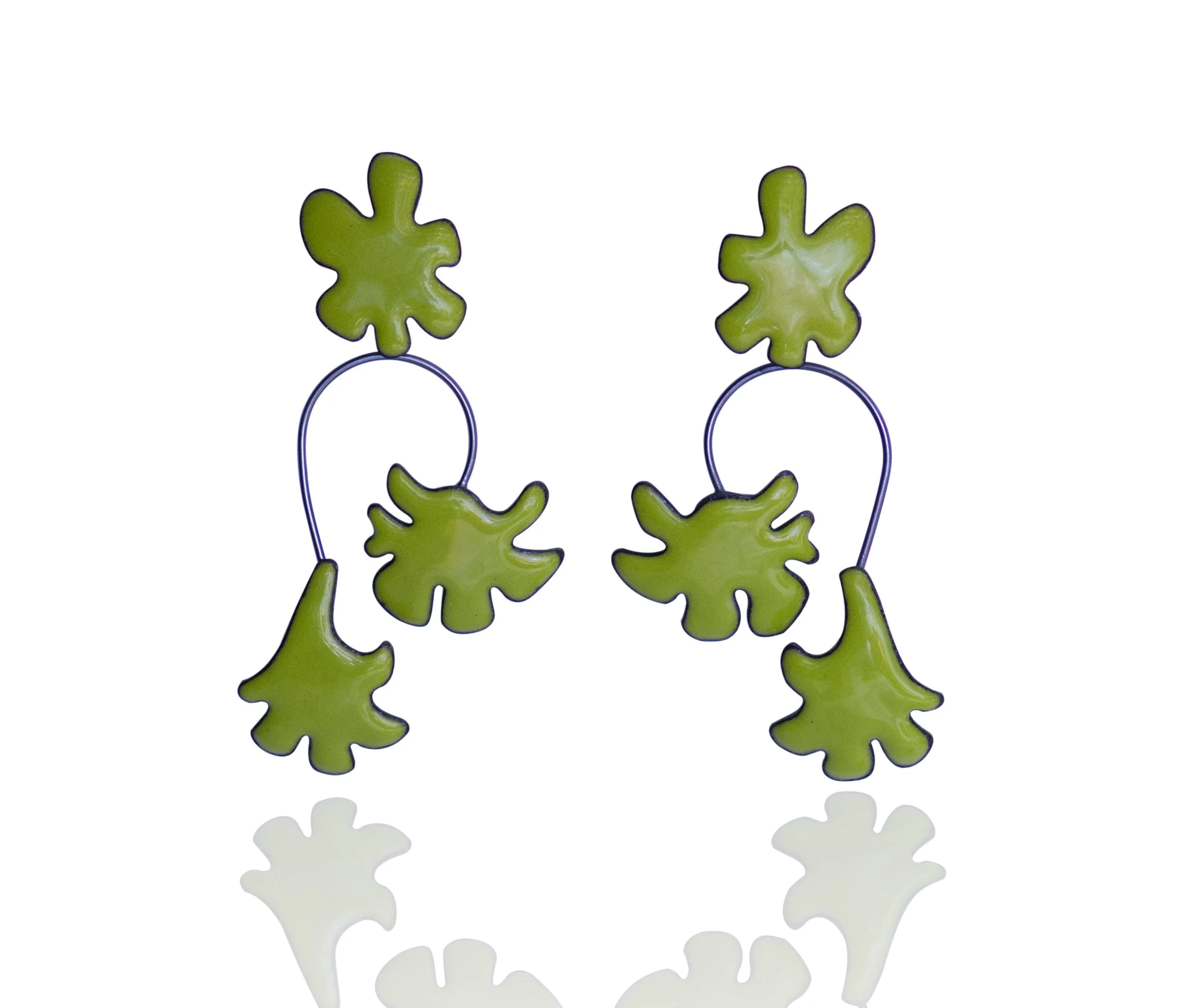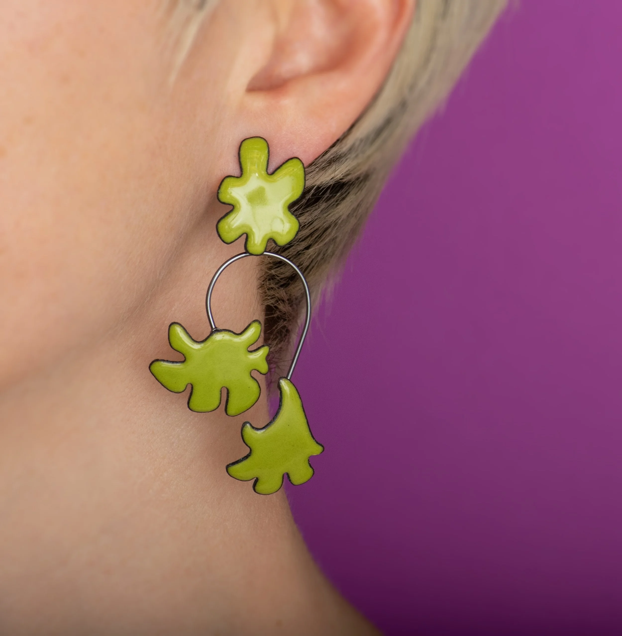 Quirky double spiral enamel earrings in Matte Harvest Blue and Mint Green. These earrings are hand pierced, formed and enameled then treated with a matte finish for a more graphic look. The lower spiral swings for added movement. Finished with a sterling silver post finding.